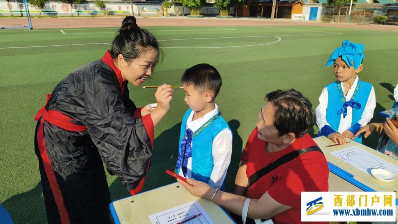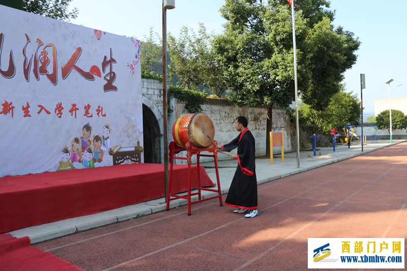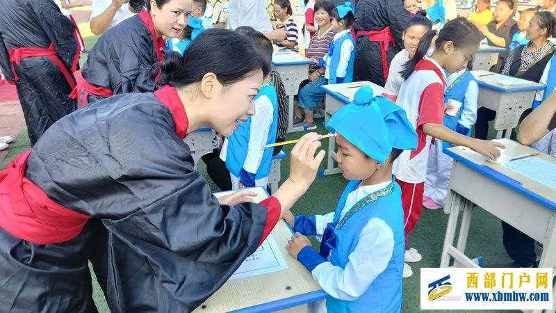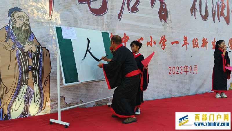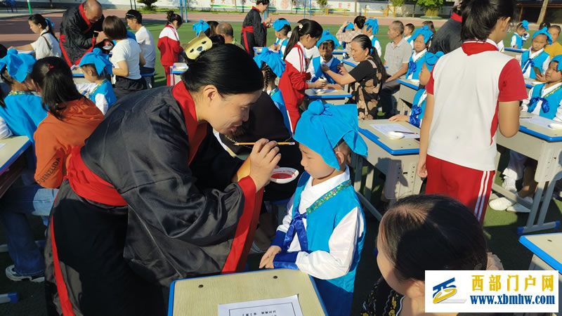 開筆禮共有正衣冠、朱砂啟智、擊鼓鳴志、行拜師禮、茶敬親師、啟蒙描紅等六項儀式。一年級新生在老師指導下,立整衣領,拜師行禮,工整書寫“人”字,將尊師美德、明德修身銘記于心。
